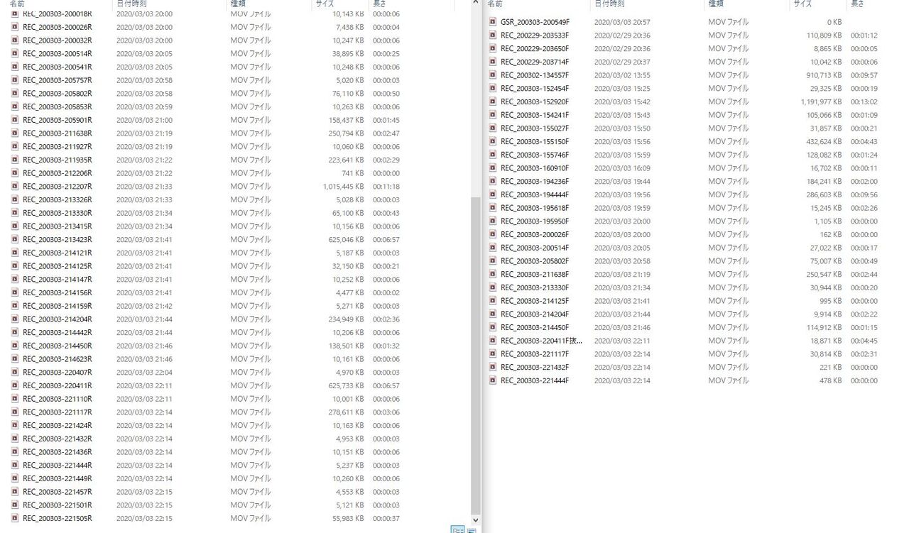 フロントカメラとリアカメラのファイルが異様に小分けされているのは、カメラが起動する際リアカメラから起動し、フロントカメラが起動する仕組みだそうで、カメラに問題が発生するとリアカメラから再起動しなおすそうです。そのためフロントカメラがノイズで問題が発生して、はい!再起動~となりファイルが小分けになったわけです。