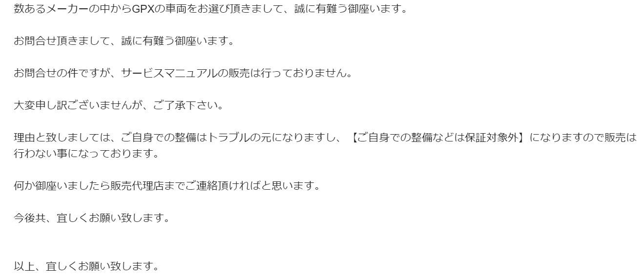 ワンチャンに掛けまして、購入元であるMFD静岡清水店にも、GPXジャパンからのメールの後に問い合わせてみました。しかし、一足遅く…ちょうど昨日GPXジャパンの方から「サービスマニュアル売らないで」との通達があったそうです…自分がGPXジャパンに問い合わせたのは一昨日…