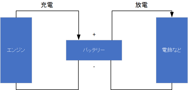 バイクに限らず、エンジンで動く乗り物は図5で示したような構造になっているようです。図5 発電機とバッテリー
