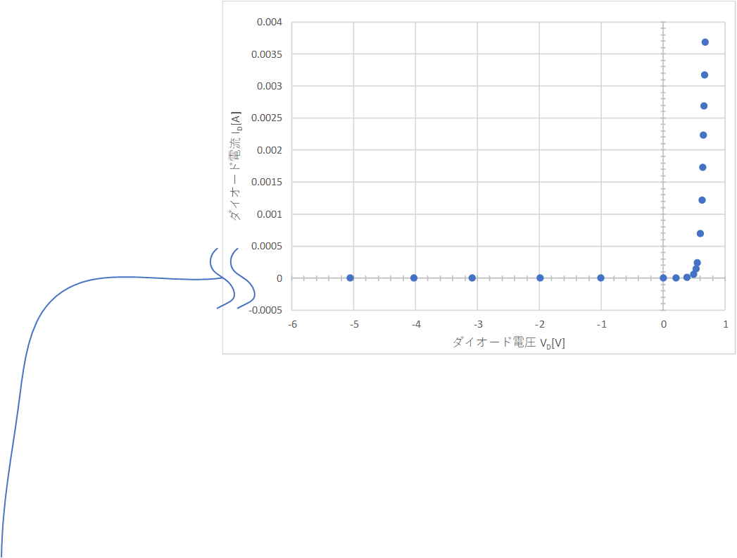 一方、この実験では確認できませんでしたが、メチャメチャマイナスの電圧を印加するといつか図4のように、反対側の電流が流れ出します。いつ流れ出すかはわかりません、流れた時はぶっ壊れた時なんで(笑)この時の電圧を逆方向電圧降下電圧と言います。