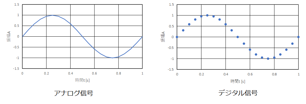 アナログ信号は途切れることなく連続のデータのことを言います。一方デジタル信号は〇 sの時に△の値が出ている、点の集合体です。では、私たち人間が見ている世界はどちらでしょうか、これはアナログです。例えば今あなたが見ている景色は光の波が物体に反射することで、目に入ってきて知覚することが出来ます。この光の波は途切れることなく連続です。(光の波動性と粒子性の話をするとめんどくさくなるので、ここでは光を波としています。)ではこの光をデジタルカメラで見るとどうでしょうか?カメラのレンズに入ってくる光はアナログですが、このデータを保存するときはデジタルに変換します。なぜかって?機械は2進数で動いているじゃないですか。二進数はonかoffかで判断するコンピュータの言語です。つまり、機械はデータを保存するときに時間を細かく分割して、〇 sの時に△の値が出ていたと保存するわけです。