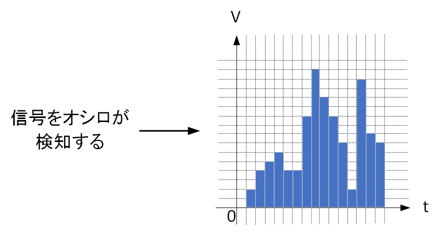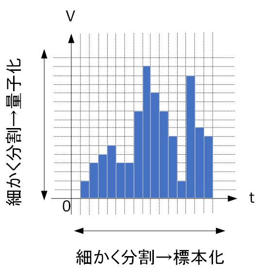 ここからはデジタルオシロスコープの話になります。上記の「データを〇 sの時△の値で表示して波形を見る」が重要だといいましたね?このうちの「データを〇 sの時」の部分を標本化、「△の値」の部分を量子化と言う手順でデータを得ます。図5に示した意味です。