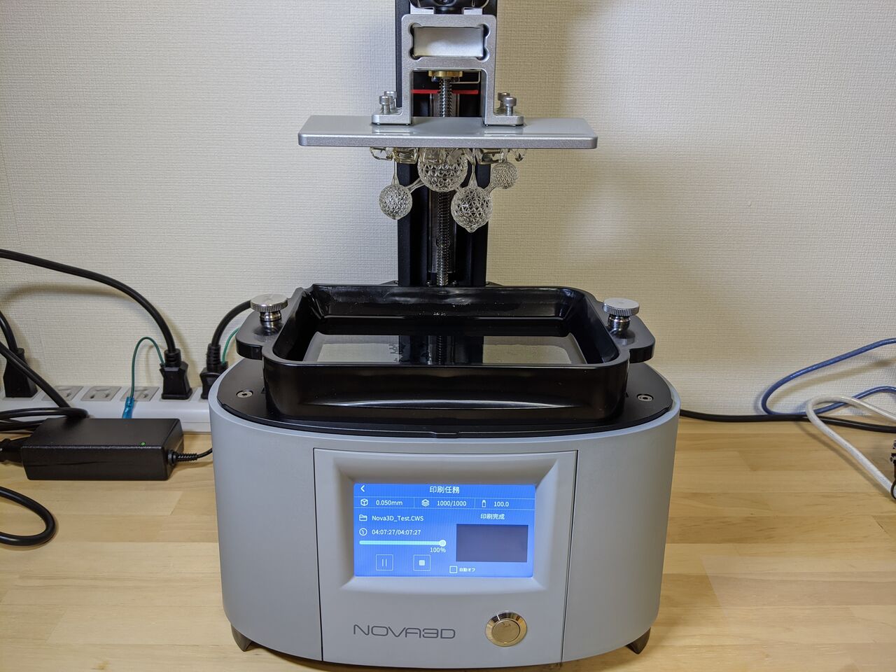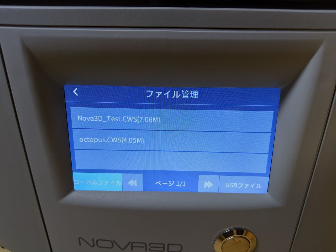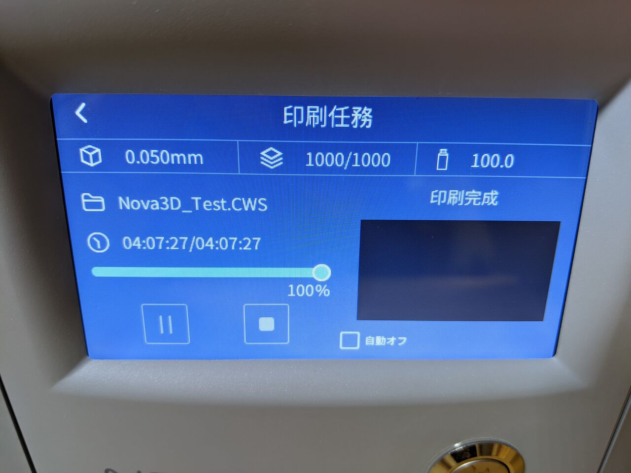 と、いう事で元々プリンターの中に入っていたテストデータを印刷してみました。使用したのはNOVA3Dの標準クリア樹脂です。電源入れるとこんな画面になります。