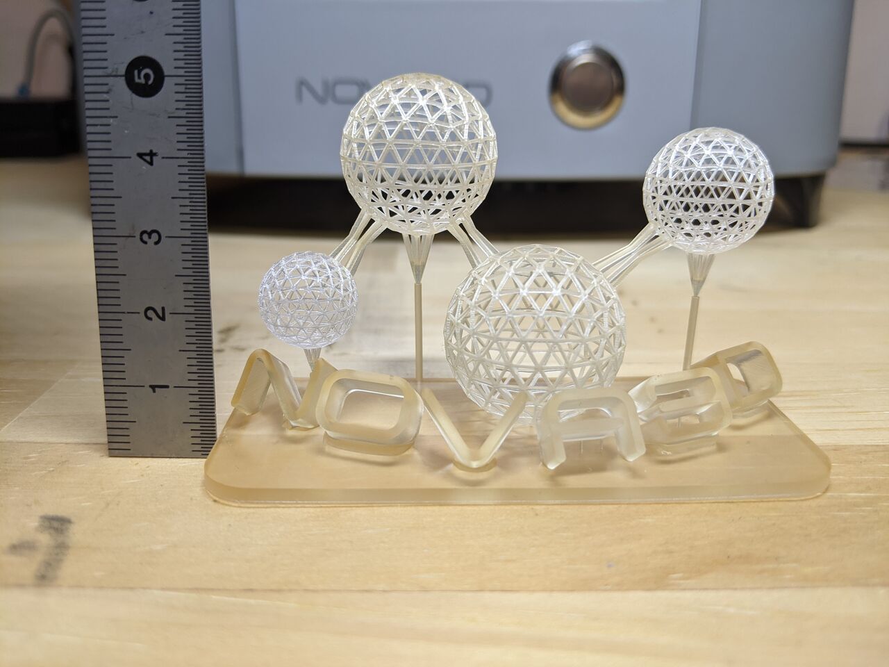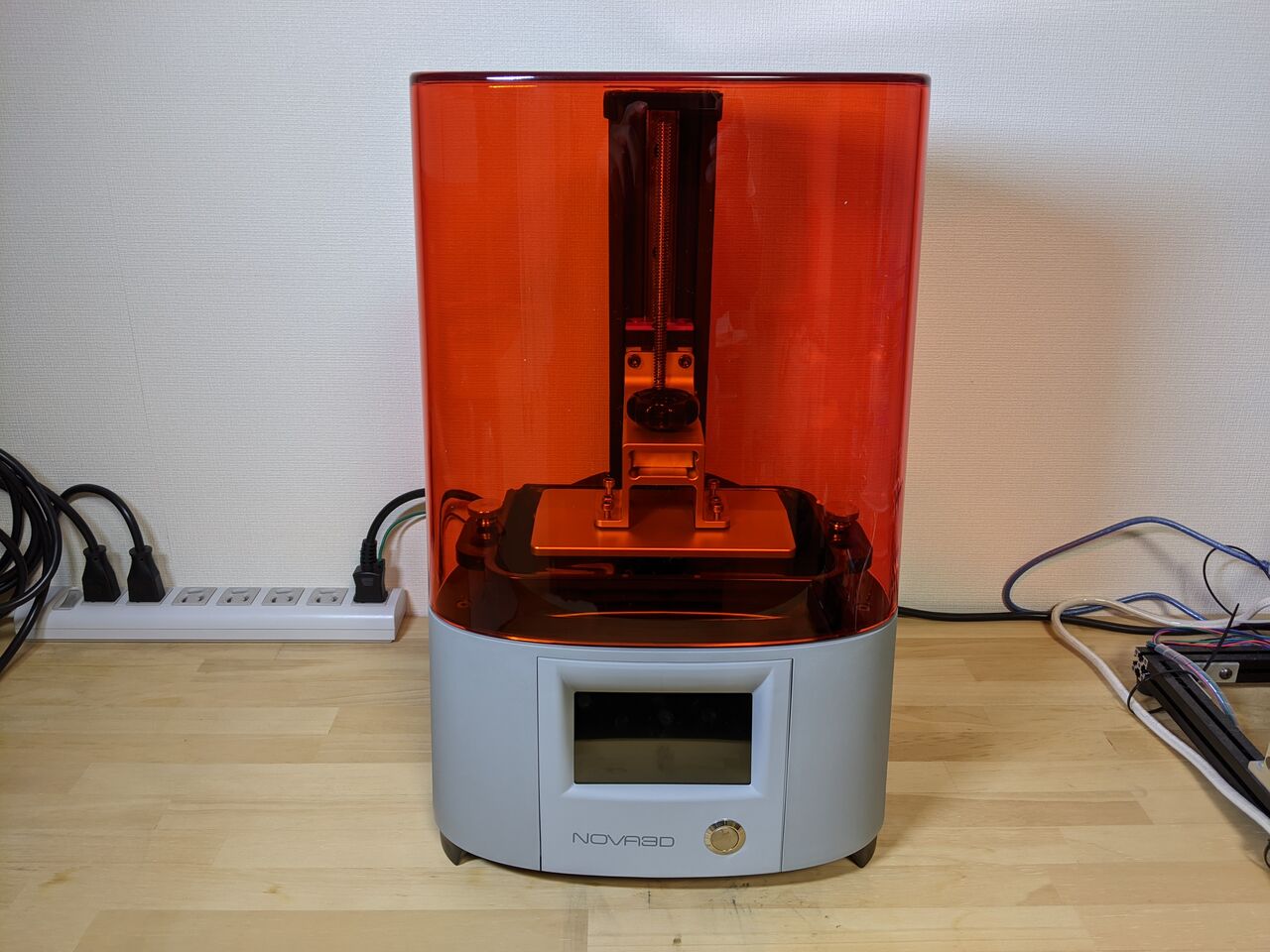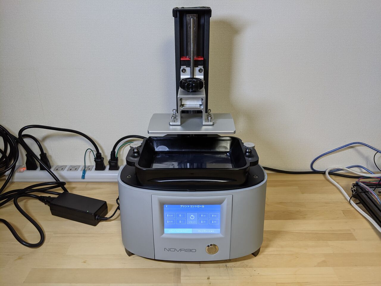 と、いう事で元々プリンターの中に入っていたテストデータを印刷してみました。使用したのはNOVA3Dの標準クリア樹脂です。電源入れるとこんな画面になります。