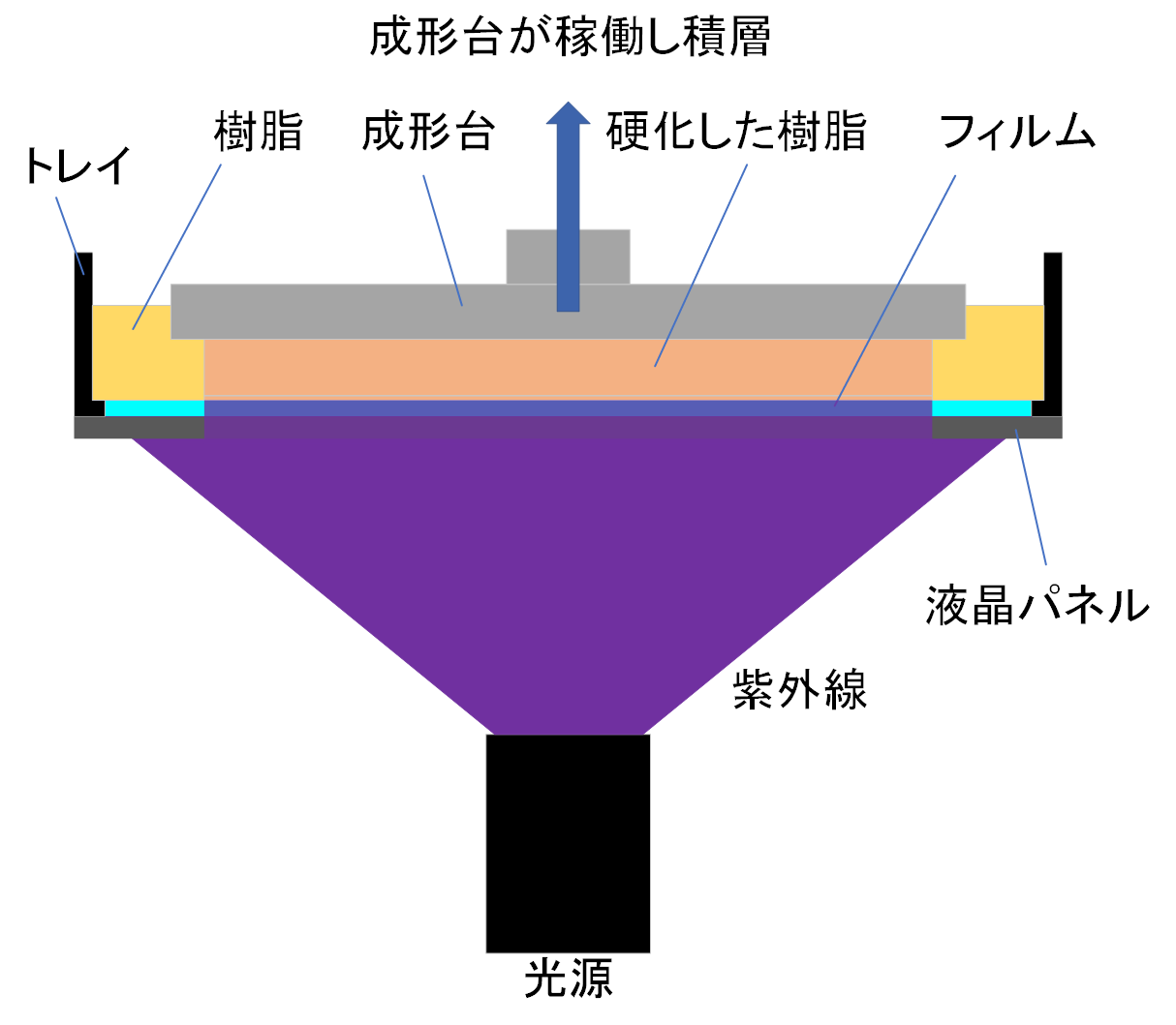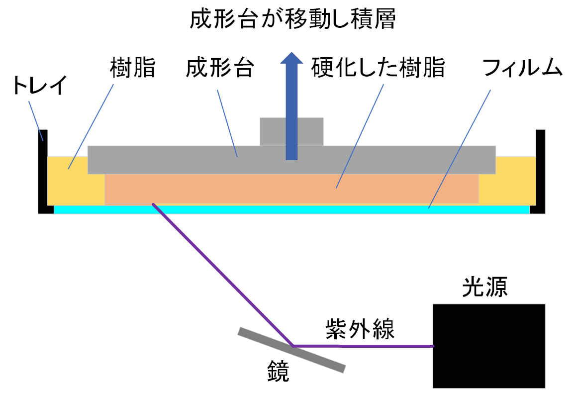 紫外線を当てると硬貨する樹脂を使用し、光を当てて物体を成型する方法