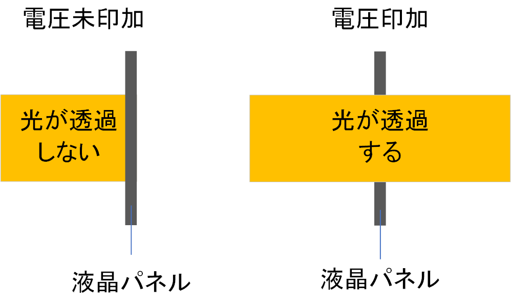 図2にDLP方式の概略図を示します。図3に液晶パネルの特徴概略図を示します。図に示されているように、紫外線レーザーを液晶パネルを用いてフィルタリングすることで、レジンを硬化させることで物体を成型していきます。液晶パネルはざっくり説明すると、図3のように光を透過させたり、遮断したりする機能を持ったパネルです。利点は面で成形できる。欠点は精度が液晶パネルの解像度に依存する。ってな感じです。