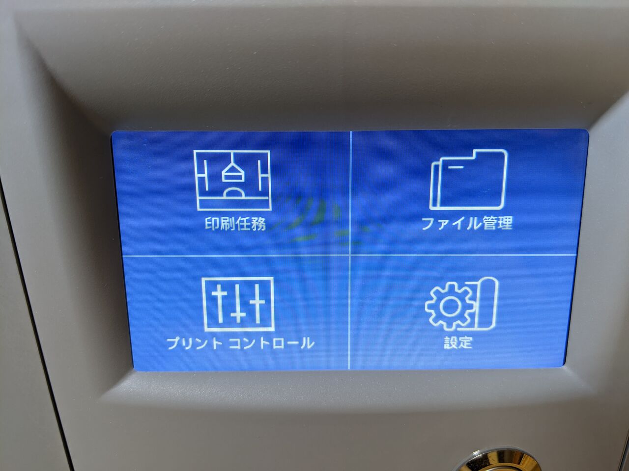 プレートが下まで下がったら、紙をスライドさせて引っ掛かりが無いか確認します。引っ掛かりが無かったら、またプレートを上に動かします。そして、画面左上の「<」を押してメニュー画面に戻ります。次に「設定」を押します。