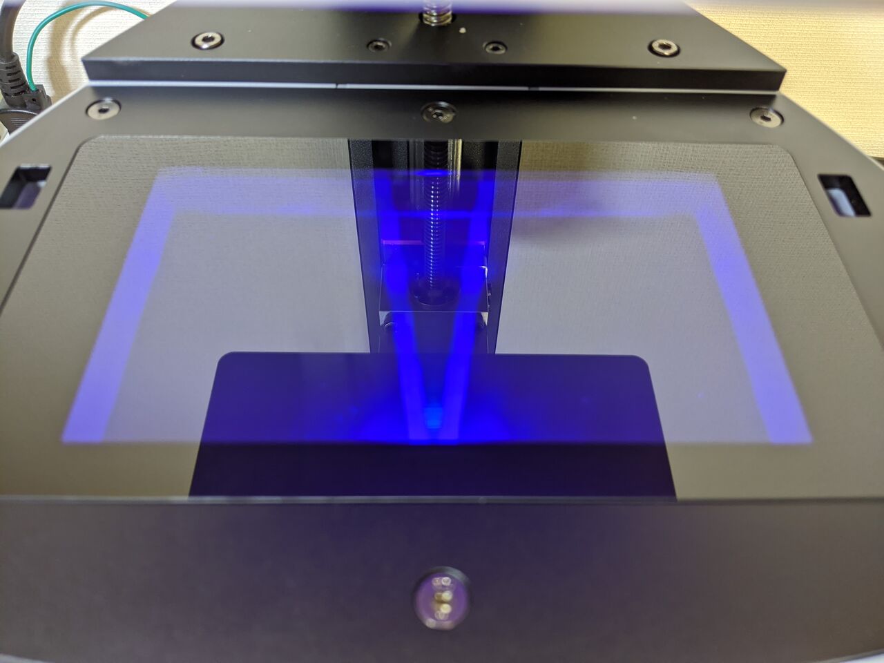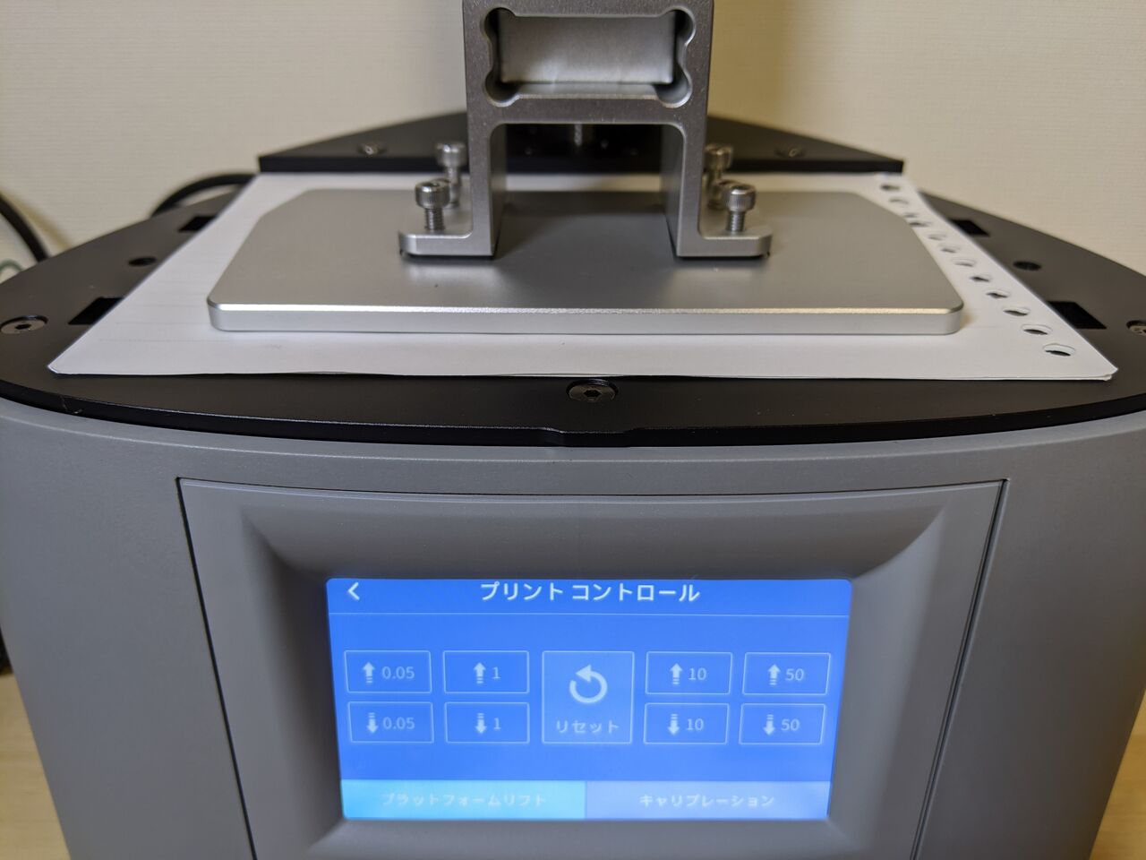 という事でまずは、印刷前の初期確認から。説明書は英語と中国語で付属していました。この説明書によると、まずはプレートが水平かどうかを確認して、つぎに紫外線が出るところの液晶に問題が無いか確認するそうです。