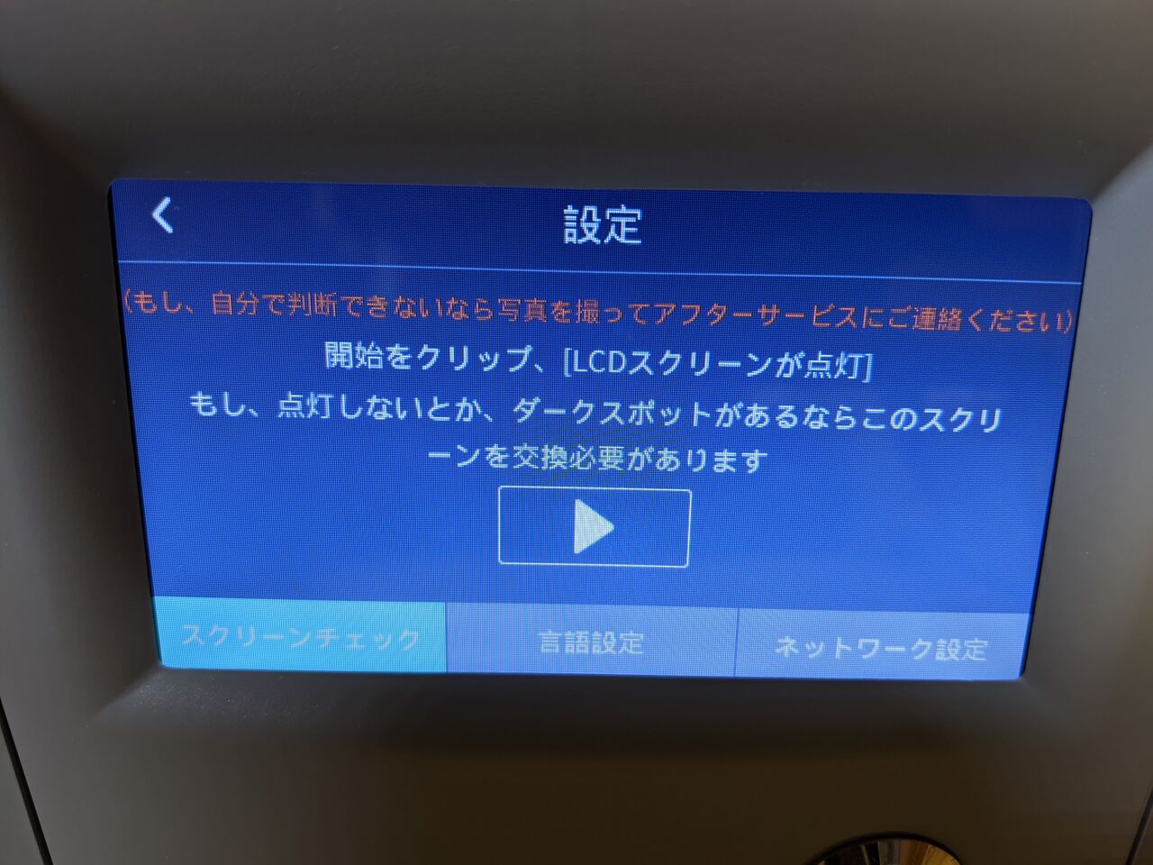 スクリーン部分が光りました。最初はScreen Test 10 sって文字が出てきました。ここで、光り方に欠けが無いか確認するそうです。かけてたらカスタマーセンターに連絡してと書いてありました。