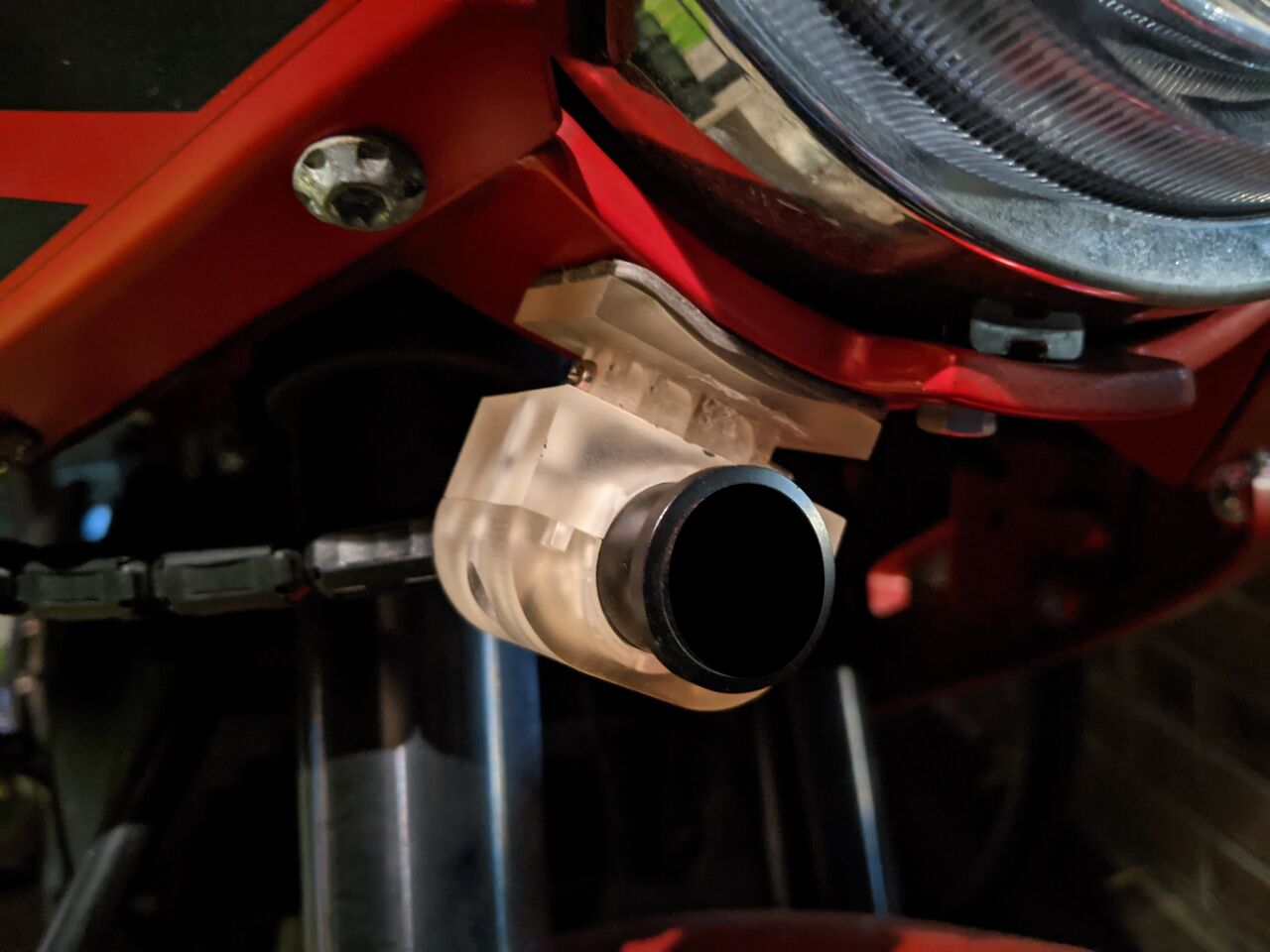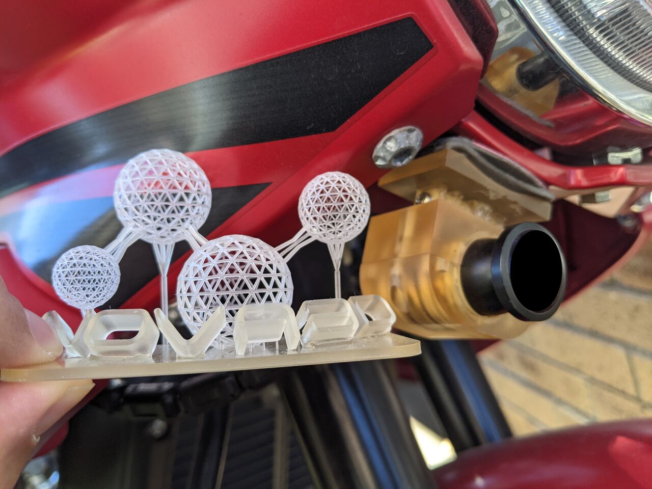今回印刷した奴、バイクについているのでずっと外にあります。付けてから1週間ほどしたら、エグイ日焼けを起こしました(笑)使用したのはNOVA3Dの標準クリア樹脂です。室内に保管していたテストプリント(印刷後1ヶ月経過)と比較すると、違いは一目瞭然です!!図6 メチャメチャ日焼けしたNOVA3Dの標準クリア樹脂